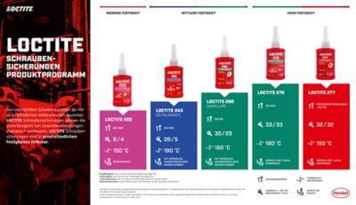 Dank einer LOCTITE Schraubensicherung werden Gewindeverbindungen zuverlässig gesichert und abgedichtet. Die Loctite Schraubensicherung funktioniert durch einen Stoffschluss von Mutter und Schraube. Das konserviert die Kontaktflächen und erlaubt eine zuverlässige Demontage. Ein definiertes Losbrechmoment macht das Lösen der Schraubverbindung zu jedem Zeitpunkt möglich. Durch die Auswahl des entsprechenden LOCTITE Produkts bestimmen Sie die Festigkeit: niedrig- bis mittelfeste Produkte können mit Handwerkzeugen demontiert werden. Für hochfeste Produkte empfehlen wir zusätzlich eine lokale Erwärmung.
